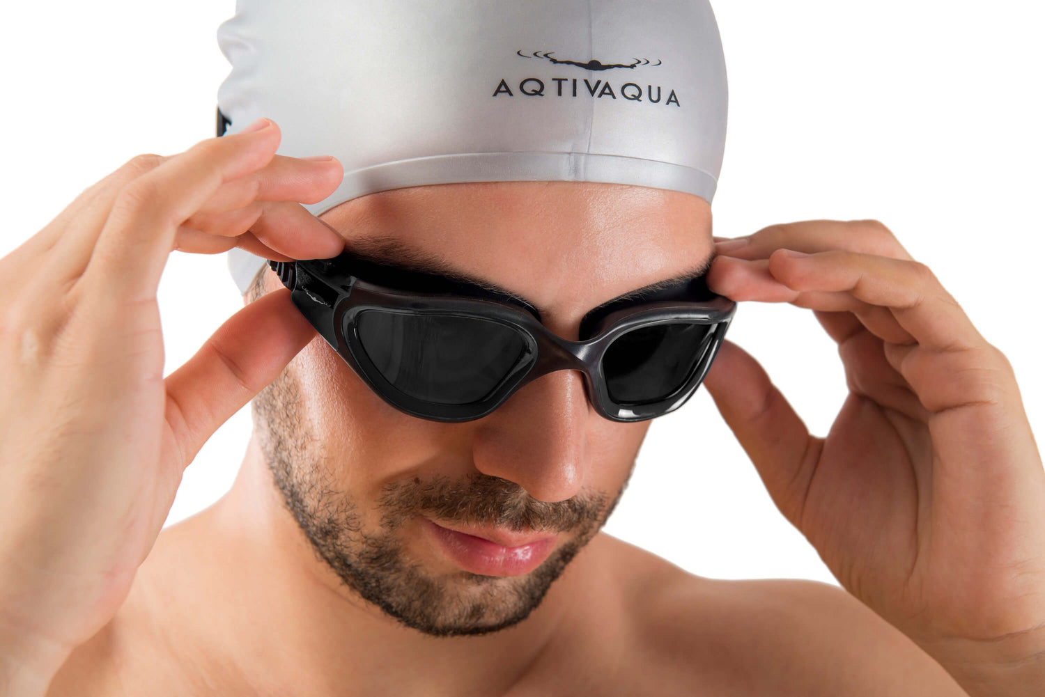 • Image highlighting the soft silicone nose bridge of Aqtivaqua DX Wide View Swimming Goggles, demonstrating its flexibility for a comfortable and customizable fit